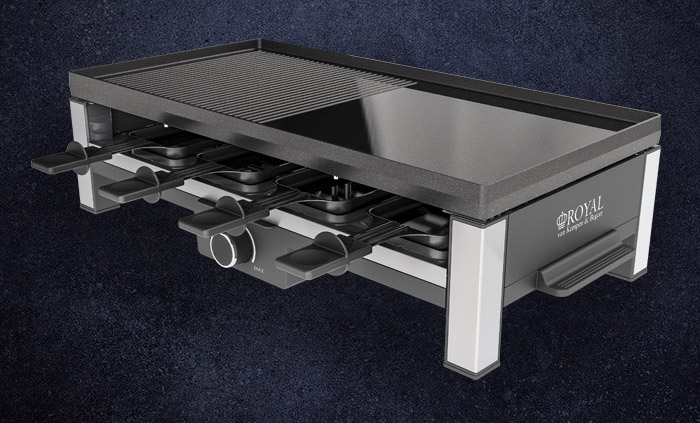 Dit gourmetstel / raclette toestel is in Duitsland gemaakt en geschikt voor 8 personen. Het leuke is dat je niet alleen in de pannetjes kan bakken maar ook op kan grillen. Dat kan op de natuurstenen grill en grillplaat die je langs twee zijdes kan gebruiken (vlak of geribbeld). Het is dus een 3-in-1 toestel.